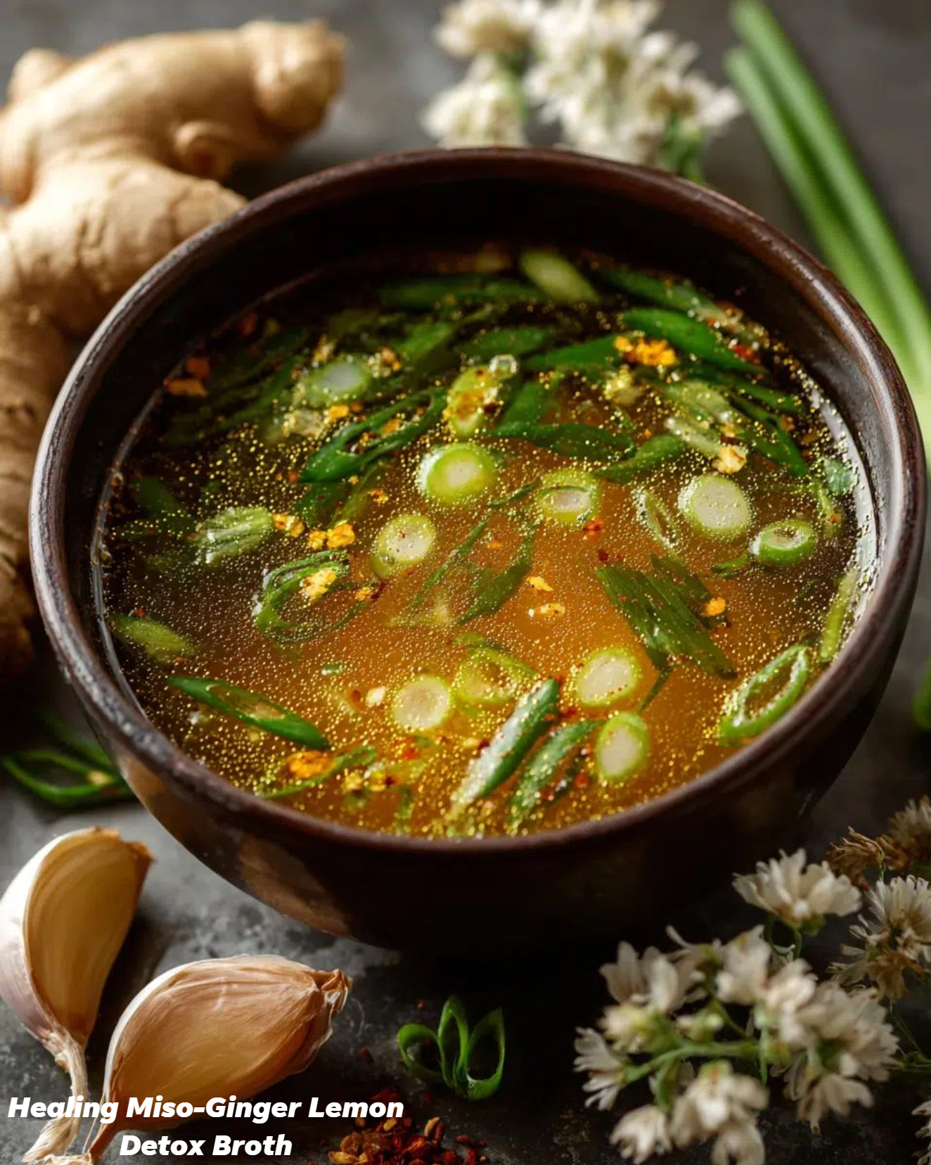 Healing Miso-Ginger Lemon Detox Broth is a warm, nourishing drink designed to support digestion, immunity, and gentle detoxification. Made with white miso, fresh ginger, lemon juice, and garlic, this broth is rich in probiotics, antioxidants, and anti-inflammatory compounds.