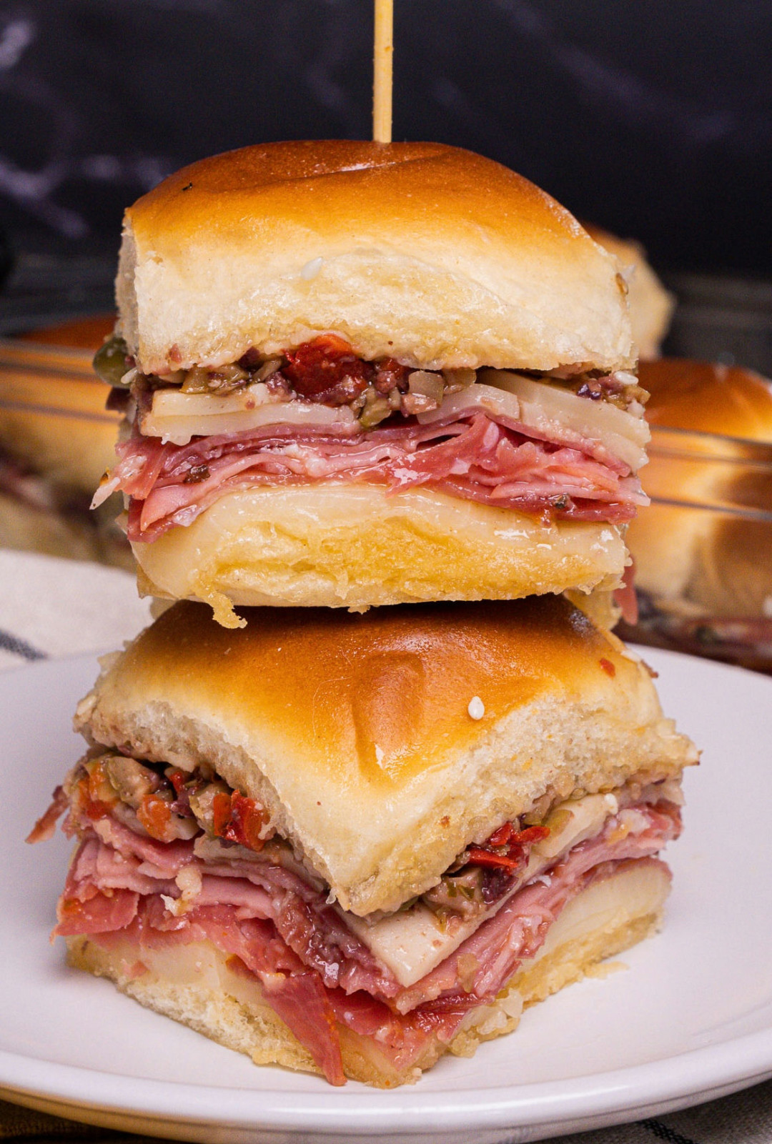These Muffuletta Sliders are a fantastic way to enjoy the classic flavors of a New Orleans muffuletta sandwich in a fun, shareable format. Layers of savory Italian cured meats, two types of cheese, and a zesty olive salad are baked on soft Hawaiian rolls until warm and melty. They make a perfect appetizer, party snack, or even a quick meal.